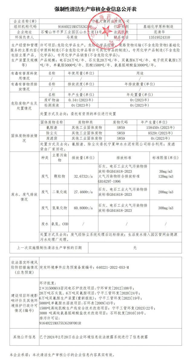 根據(jù)《自治區(qū)生態(tài)環(huán)境廳、發(fā)展和改革委員會關(guān)于公布 2024 年開展強(qiáng)制性清潔生產(chǎn)審核重點(diǎn)企業(yè)名單的通知》(寧環(huán)發(fā)〔2024〕39 號)文件,公司被納入自治區(qū) 2024 年開展強(qiáng)制性清潔生產(chǎn)審核重點(diǎn)企業(yè),現(xiàn)將公司相關(guān)信息公開公布。